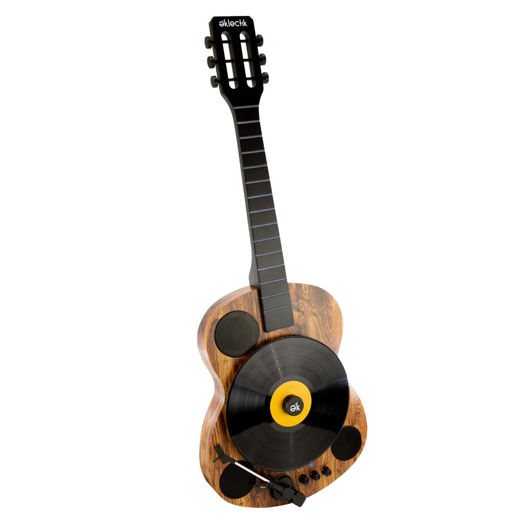Upgrade your vinyl experience with the Eklectik Guitar-Shaped Wall-Mounted Turntable. This vertical 3-speed record player (33.3, 45, 78 RPM) spins 7", 10", and 12" records in full view, combining retro style with high-quality audio. Its wood-grain design and vintage knobs make it a stylish addition to any room, doubling as functional wall art.